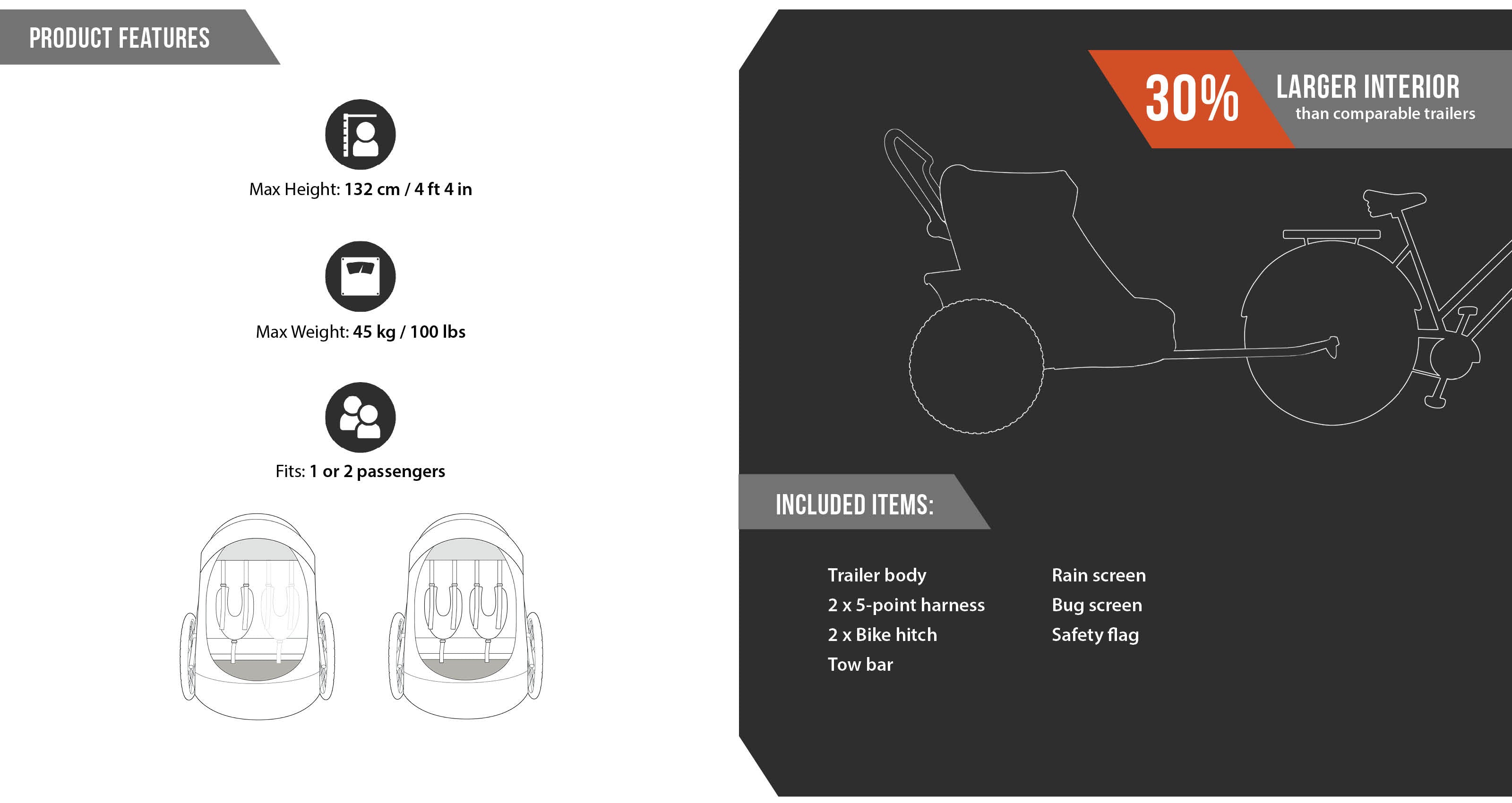 Everyday Escapades: The Wike Double transports two children (up to 52in., 100lbs) with ease. Compact for daily use, durable and safe for adventures.